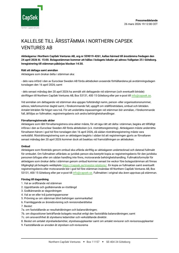 Aktieägarna i Northern CapSek Ventures AB, org.nr 559019-4261, kallas härmed till årsstämma fredagen den 24 april 2026 kl. 15:00. Bolagsstämman kommer att hållas i bolagets lokaler på adress Vallgatan 25 i Göteborg. Inregistrering till stämman påbörjas klockan 14:30.