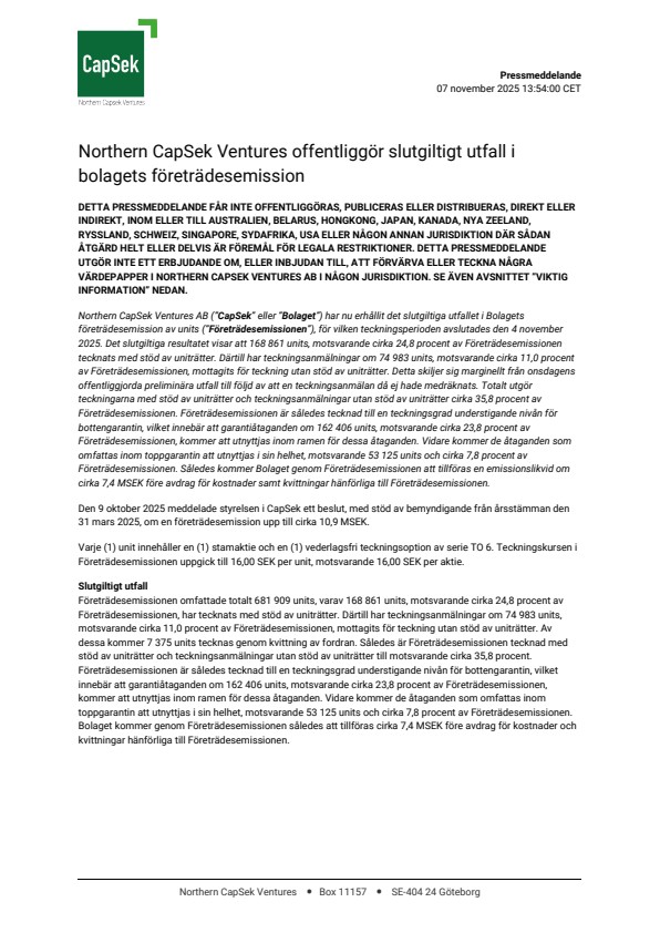 Northern CapSek Ventures AB (”CapSek” eller ”Bolaget”) har nu erhållit det slutgiltiga utfallet i Bolagets företrädesemission av units (”Företrädesemissionen”), för vilken teckningsperioden avslutades den 4 november 2025. Det slutgiltiga resultatet visar att 168 861 units, motsvarande cirka 24,8 procent av Företrädesemissionen tecknats med stöd av uniträtter. Därtill har teckningsanmälningar om 74 983 units, motsvarande cirka 11,0 procent av Företrädesemissionen, mottagits för teckning utan stöd av uniträtter. Detta skiljer sig marginellt från onsdagens offentliggjorda preliminära utfall till följd av att en teckningsanmälan då ej hade medräknats. Totalt utgör teckningarna med stöd av uniträtter och teckningsanmälningar utan stöd av uniträtter cirka 35,8 procent av Företrädesemissionen. Företrädesemissionen är således tecknad till en teckningsgrad understigande nivån för bottengarantin, vilket innebär att garantiåtaganden om 162 406 units, motsvarande cirka 23,8 procent av Företrädesemissionen, kommer att utnyttjas inom ramen för dessa åtaganden. Vidare kommer de åtaganden som omfattas inom toppgarantin att utnyttjas i sin helhet, motsvarande 53 125 units och cirka 7,8 procent av Företrädesemissionen. Således kommer Bolaget genom Företrädesemissionen att tillföras en emissionslikvid om cirka 7,4 MSEK före avdrag för kostnader samt kvittningar hänförliga till Företrädesemissionen.