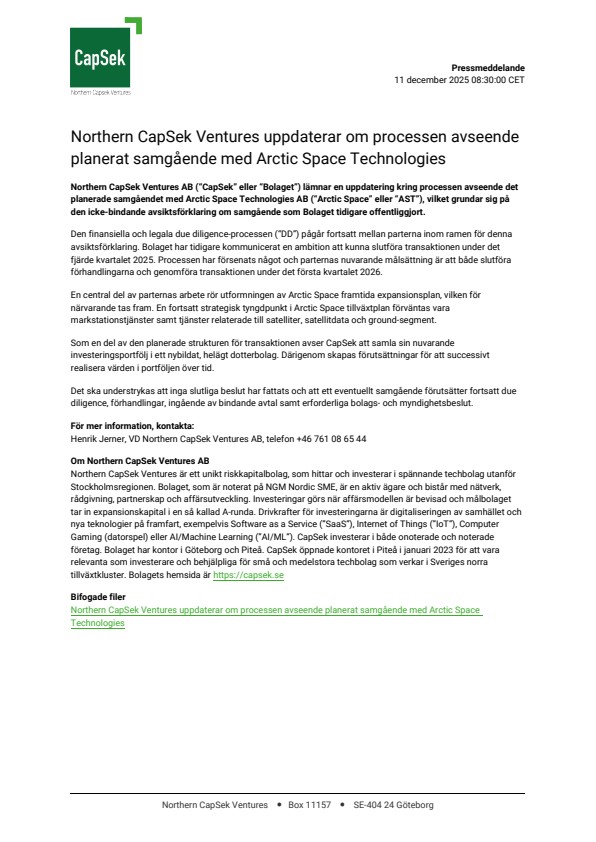 Northern CapSek Ventures AB (“CapSek” eller “Bolaget”) lämnar en uppdatering kring processen avseende det planerade samgåendet med Arctic Space Technologies AB (“Arctic Space” eller “AST”), vilket grundar sig på den icke-bindande avsiktsförklaring om samgående som Bolaget tidigare offentliggjort.